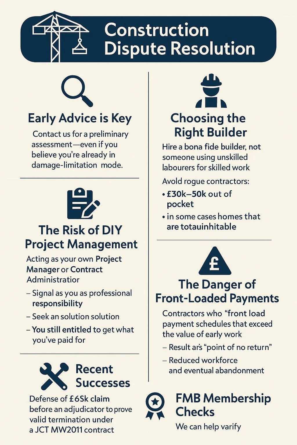 Successfully argued before an adjudicator that the termination of the contractor’s employment under a JCT MW2011 contract was not valid.
